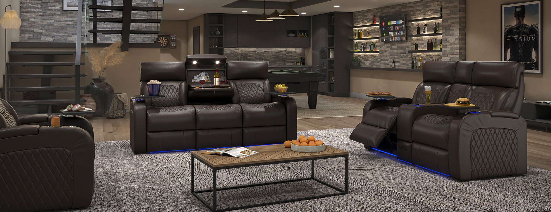 In addition to these incredible features, the Bliss also comes with Octane's LED lighting system which provides a soft blue glow around the cupholders and baserail, along with deep storage compartments in each arm. The seats come with 2 USB's on the inside arm allowing you to charge your electronics while lounging in style. At the front of each arm is an accessory dock, allowing you to add a whole host of lifestyle accessories such as a wine glass holder, phone holder, swivel tray tables and many other items. These chairs are constructed with premium pocketed coils so the seats never sag and always keep their shape and form, along with a top layer of gel infused memory foam, the premium way to manufacture furniture. The seats are then upholstered in premium top grain Italian leather. It's time to experience the true definition of luxury seating.