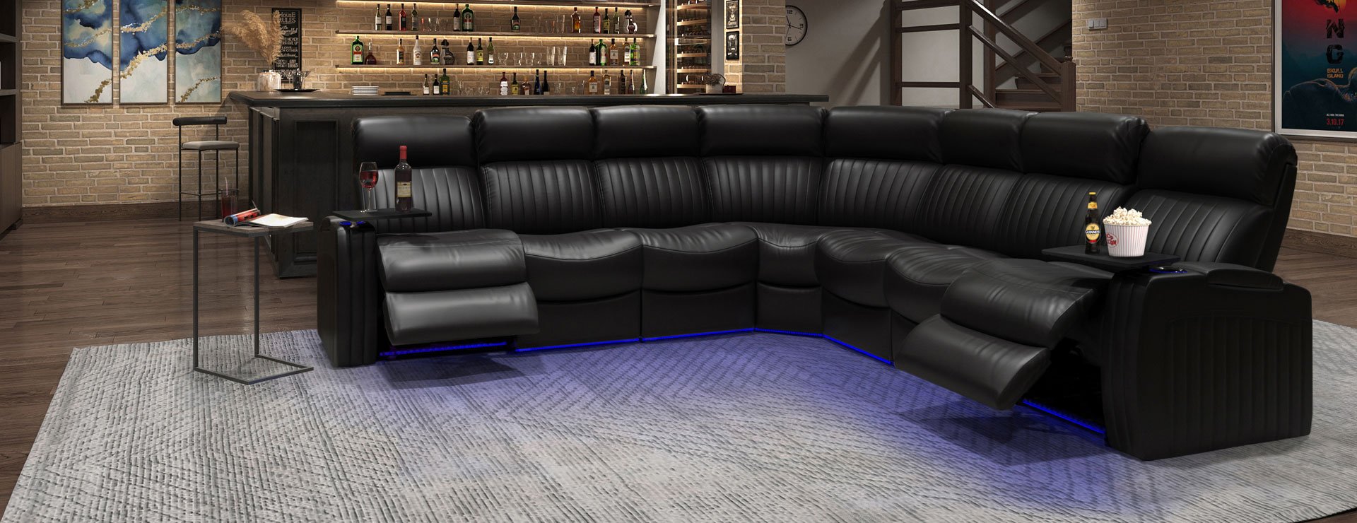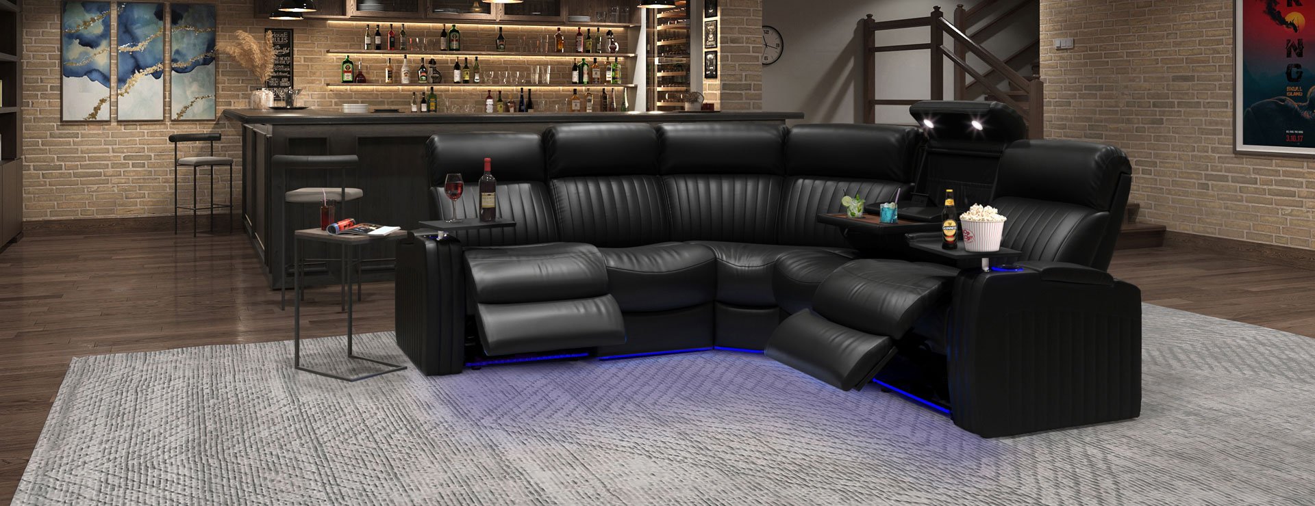 One of the most innovative seats we carry is the middle drop own console that has an array of accessories and features we are sure you will love. The seat folds down to reveal an amazing wood laminate table and two extra cupholders. It has dual reading lights and a magazine pouch to make it easy to enjoy a book while relaxing on this sectional. The charging station has USB ports, a 120V plug, and a wireless charging pad, making it easy to charge any of your devices. This seat is sure to enhance our movie watching experience and we can guarantee you will fall in love with the convenience it offers!