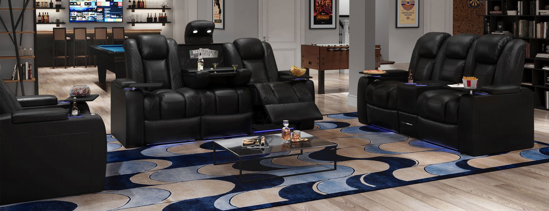 This awesome piece of furniture also comes fully equipped with some amazing features. The center storage console has LED lighted cupholders and a power station for charging your devices. The base rail is lighted with LED lights and a pull-out storage drawer is right next to that to make the seating experience that much better. The armrests have hidden storage and an accessory dock for cell phone holders, popcorn bowls, or swivel tray tables