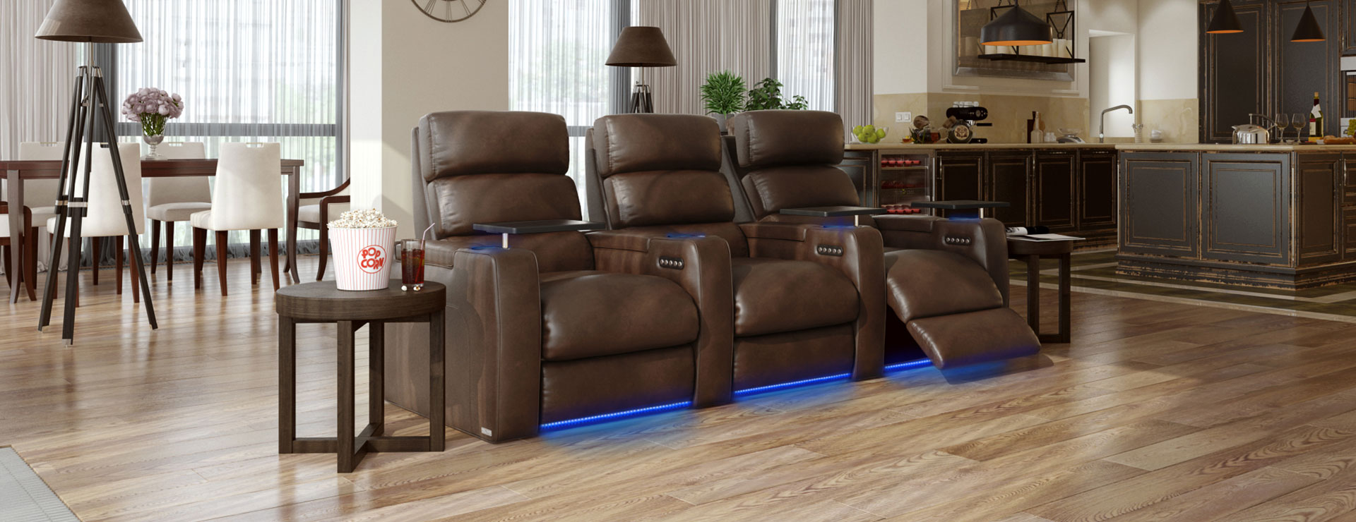 The Dream comes standard with a motorized headrest and power recline. The control switch on the inside armrest will recline the chair to the perfect angle for you, then adjust the power headrest and you are all set for the evening. Ambient base rail lighting under the seat and in the cupholders can be turned on/off from the same power controls. These lights radiate a soft blue hue and set the mood for movie night!