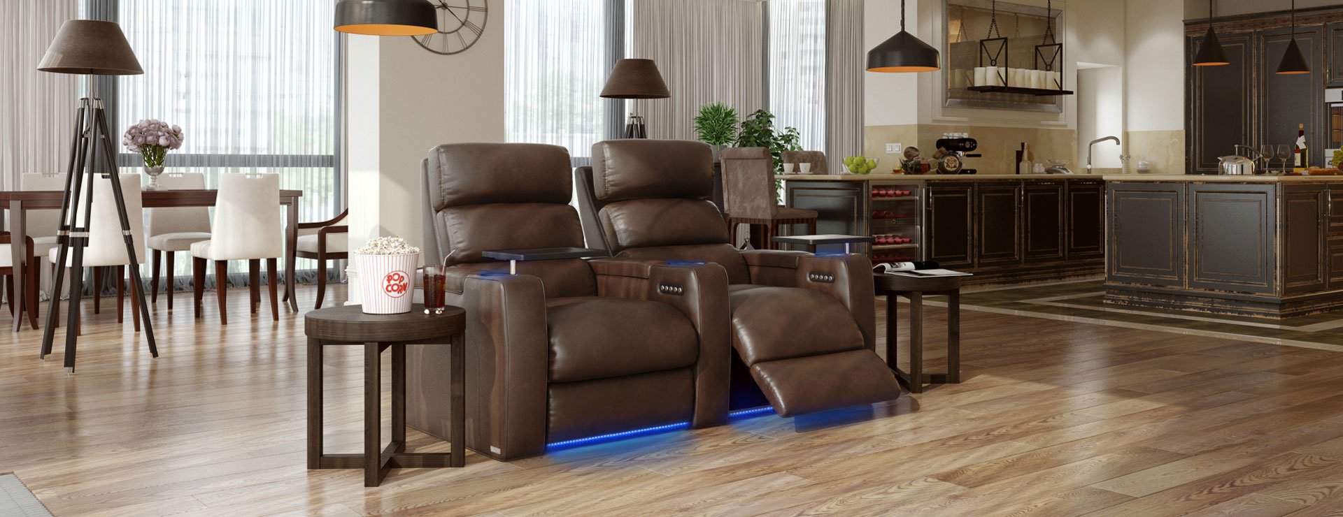 The Dream comes standard with a motorized headrest and power recline. The control switch on the inside armrest will recline the chair to the perfect angle for you, then adjust the power headrest and you are all set for the evening. Ambient base rail lighting under the seat and in the cupholders can be turned on/off from the same power controls. These lights radiate a soft blue hue and set the mood for movie night!