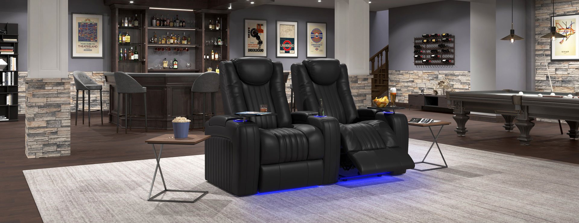 The King Max comes with a light blue LED lighting system which provides a soft blue glow around the cupholders and along the baserail of the seat for a true cinematic experience. Each recliner has a USB port so you can charge your electronics while lounging back in comfort. Enjoy deep arm storage to store all your gadgets, books and other items. Additionally, there is an accessory dock located on each arm where you can add over a dozen of our lifestyle accessories including swivel tray tables, wine glass holder, phone holder, cigar holder and much more. The seats are upholstered in black Italian top grain leather that is super soft to the touch and extremely durable, excellent for families with pets and children.