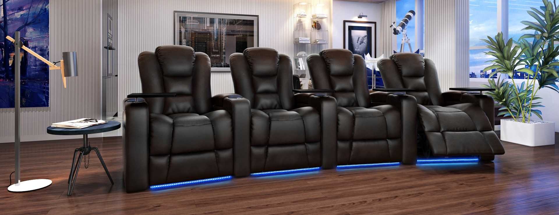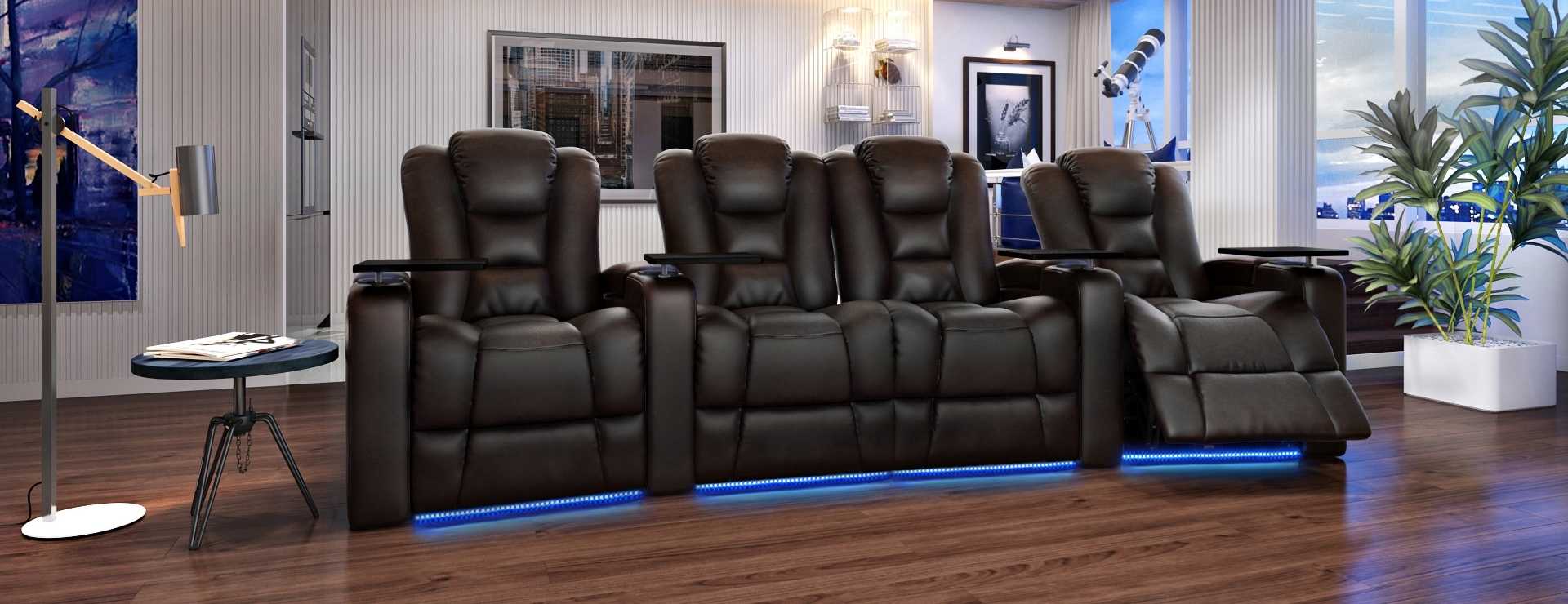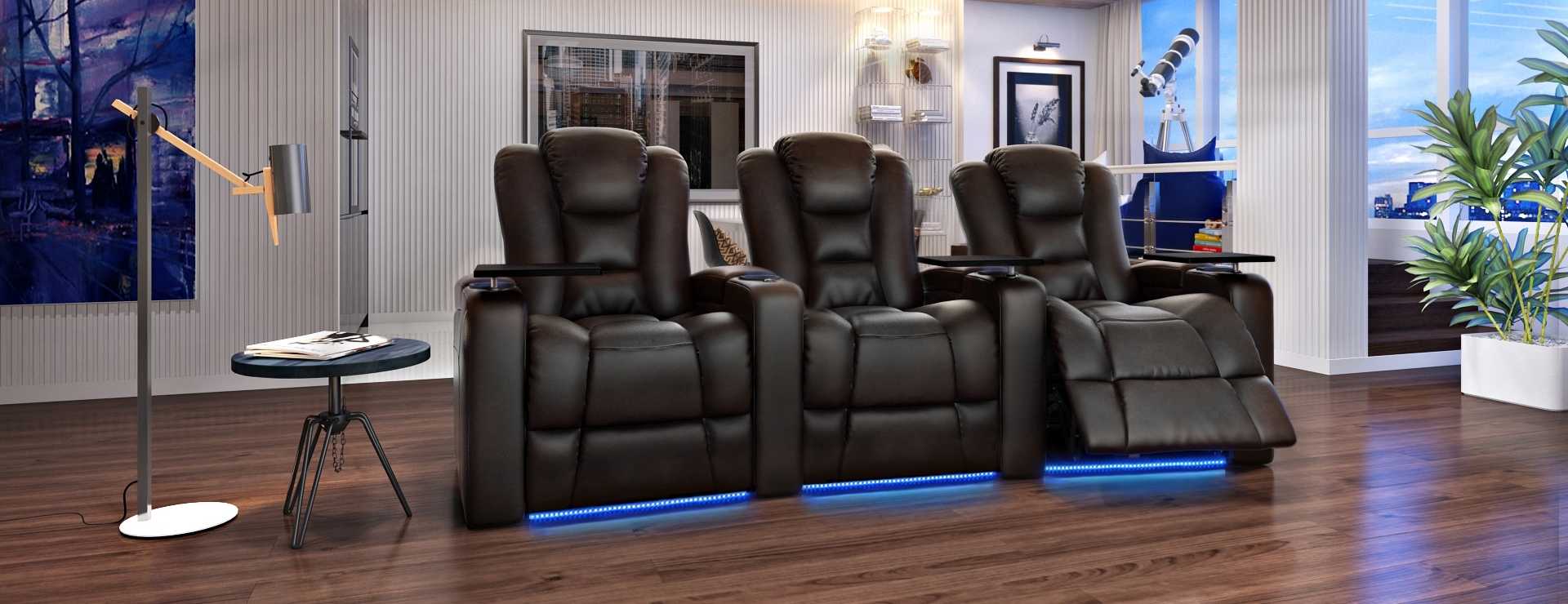 The padding on the Mega will wrap your body in pure bliss. Our foam core has a high 1.8 resiliency and is finished off with pocketed coils in the seating surface. This is a higher end quality build that ensures a lifetime of no sagging and comfort for the life of the seat. The padding is extra plush allowing you to watch movies for hours on end. The Mega is packed with all the features customers look for in theater seats. In addition to the motorized headrest are storage consoles in each arm, blue LED lighted cup holders and baserail, and an Accessory Dock located in front of the cup holders.