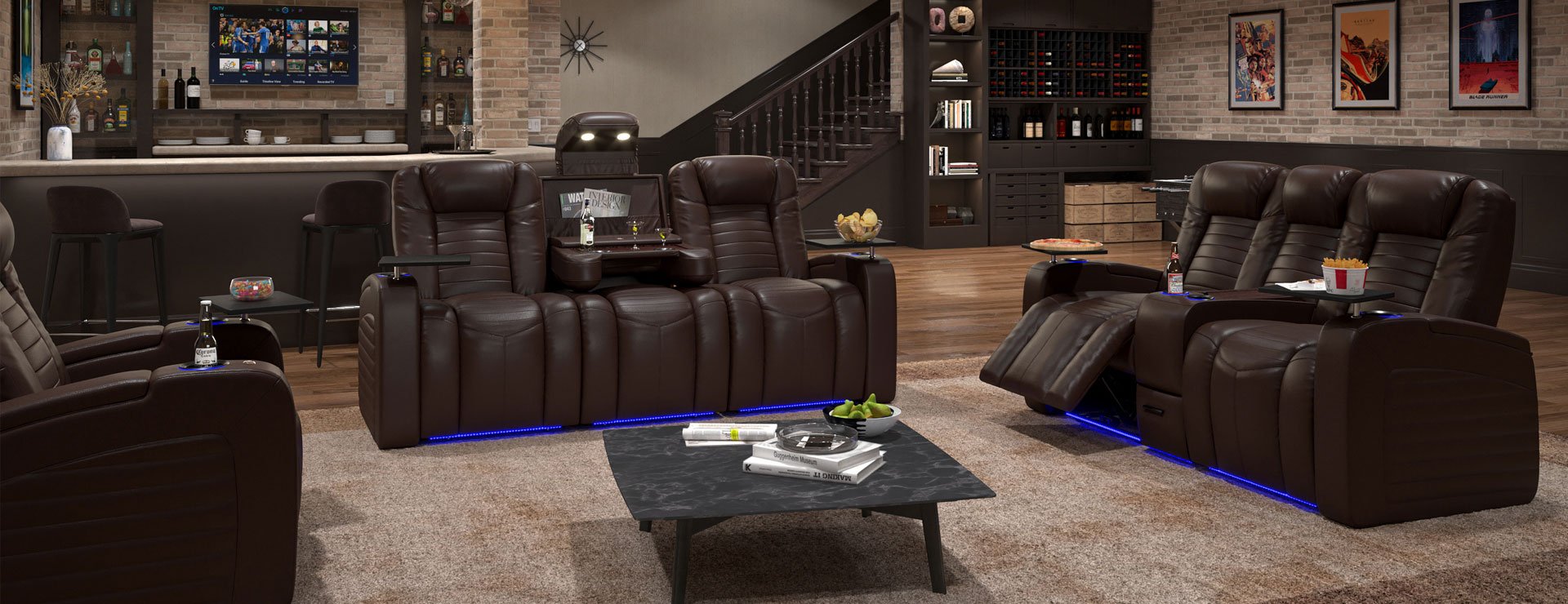 In addition to these incredible features, the Oasis also comes with Octane's LED lighting system which provides a soft blue glow around the cupholders and baserail, along with deep storage compartments in each arm. The seats come with 2 USB's on the inside arm allowing you to charge your electronics while lounging in style. At the front of each arm is an accessory dock, allowing you to add a whole host of lifestyle accessories such as a wine glass holder, phone holder, swivel tray tables and many other items. Last but not least, these chairs are constructed with premium pocketed coils so the seats never sag and always keep their shape and form, along with a top layer of gel infused memory foam, the premium way to manufacture furniture. The seats are then upholstered in premium top grain Italian leather. It's time to experience the true definition of luxury seating.