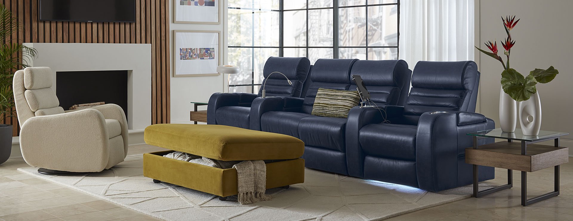 Palliser's rich history is reflected in their large assortment of carefully selected leathers and fabrics now available for your Vertex home theater seats. The leathers are categorized in grades 1000 through 6000. Leather 1000 is the most economical selection and offers the best durability, color consistency, and is excellent for everyday use. The 6000 series would be the most supple, delicate and would demonstrate the natural characteristics of each hide. With over 100 leather choices, Palliser ensures your furniture is upholstered to your exact tastes and styles.