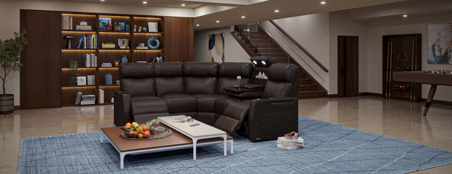 Indulge in true bliss with the Octane Solace reclining sectional. With its buttery soft Italian leather upholstery and German-engineered motors, this sofa is both luxurious and functional. The motorized headrest and lumbar support ensure maximum comfort and relaxation. And with the middle drop-down seat back, you'll have everything within reach - a table, cup holders, wireless charging, power outlets, USB ports, and storage. The blue ambient base lighting system also sets the perfect mood for movie nights.