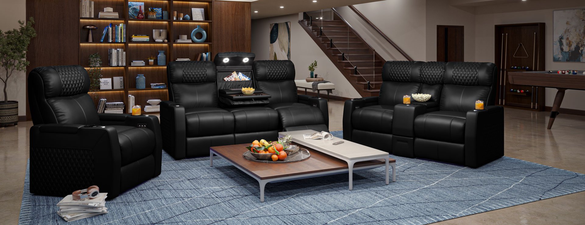Start by indulging in the diamond stitch headrest – not only does it look cool, but it also adds to the piece's authenticity. The space-saving design allows you to fit more into your entertainment space without compromising on style or quality. The bonus drop-down seatback transforms it into a wooden table complete with cupholders and power ports. Say goodbye to boring furniture and hello to innovation!