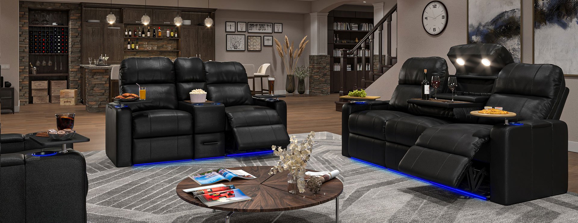 The Turbo dual console loveseat includes motorized recline and lighted cup holders as standard features. The power and lighting are managed from the inside armrest where a brushed aluminum control will turn the lights on in the cup holders and under the loveseat. A separate button will operate the smooth and quiet power motor to recline the chair to the perfect viewing angle for your relaxation. As your seat back reclines, the footrest will rise up, and you will be left ready to relax.
